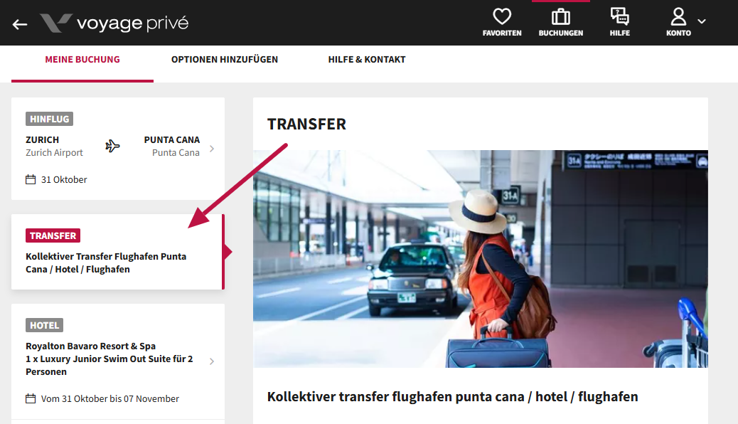 Dort finden Sie den Abschnitt Transfer – klicken Sie darauf, um die Details zum Transferservice anzuzeigen, einschliesslich Hinweise zur Abholung am Flughafen.