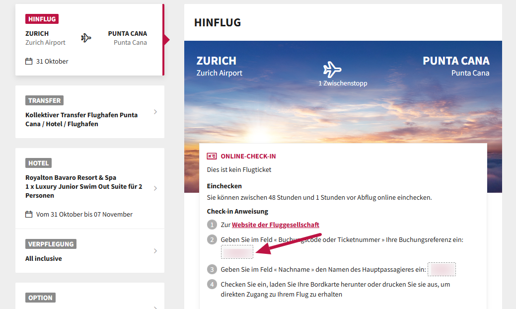 Buchungsnummer abrufen: Sie finden Ihre Flugreferenznummer im Buchungsbereich Ihres Mitgliedskontos oder in Ihren Reisedokumenten. Besuchen Sie anschliessend die Website der Fluggesellschaft – der Link befindet sich an derselben Stelle wie Ihre Referenznummer.