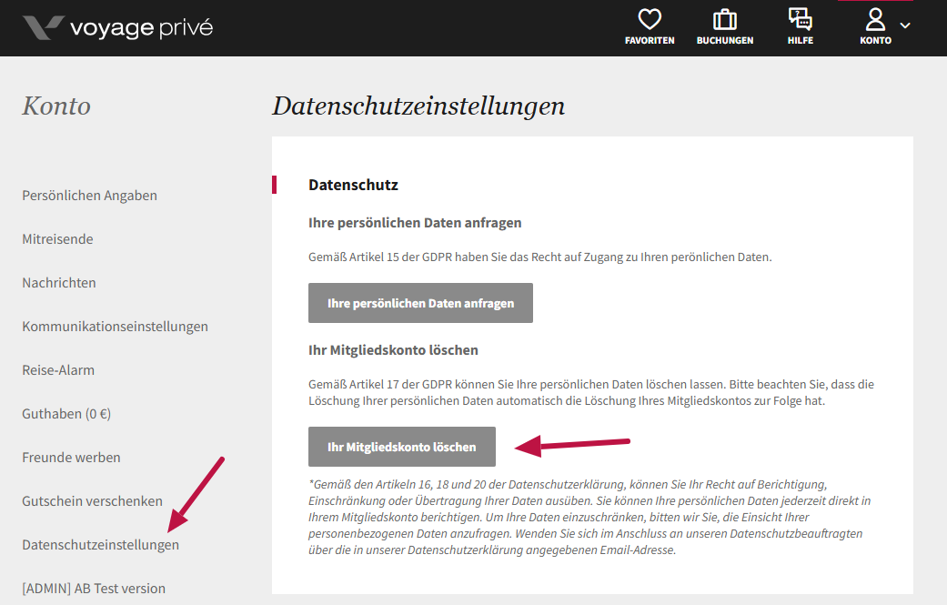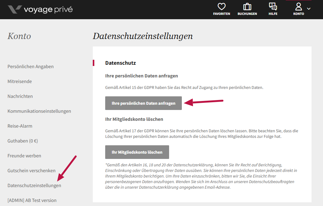 Um Ihre persönlichen Daten abzurufen, gehen Sie in Ihrem Mitgliedskonto zum Reiter Datenschutzeinstellungen.